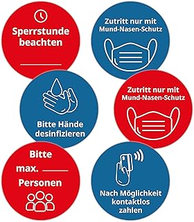 P078 | 2 Stück Hinweis-Aufkleber - Bitte Hände desinfizieren - Kontaktlos bezahlen - Zutritt nur mit Mundnasenschutz - Sperrstunde beachten (9 cm, V5 Max. Personen)